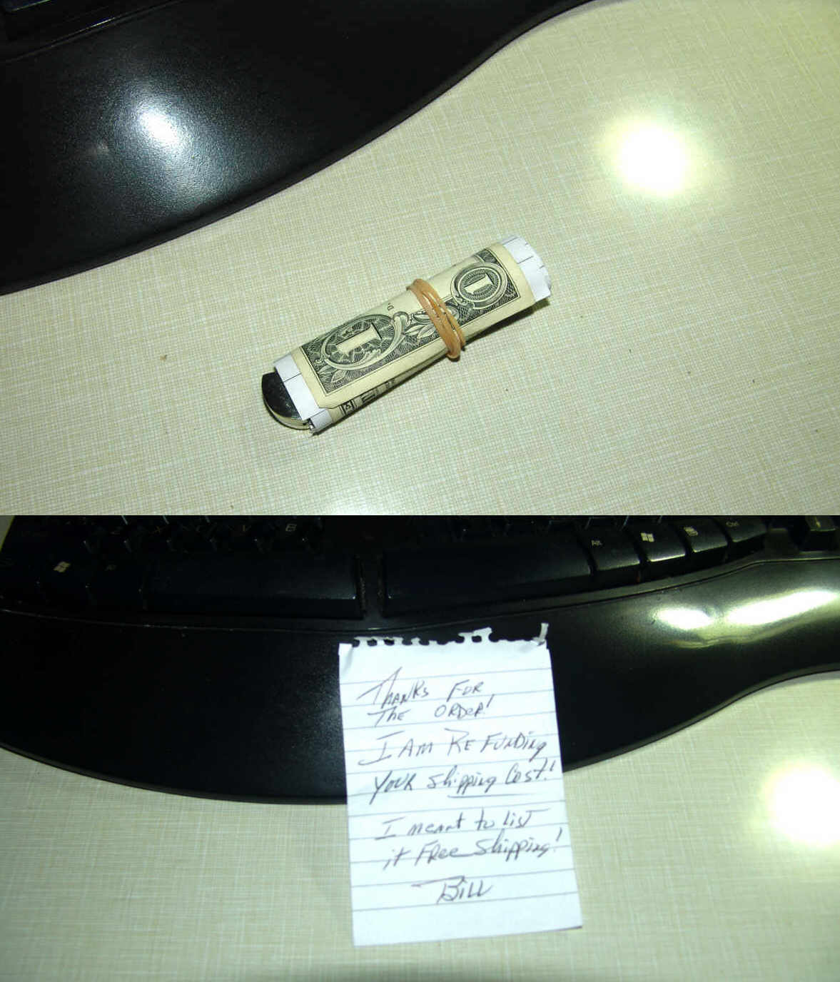 On my way out this morning I received the envelope from Sparta, TN and was content I'd gotten it. As I drove to work I opened the envelope to find my tool wrapped in two $1 bills and a note.  There seems to be a few fair and nice people left after all.