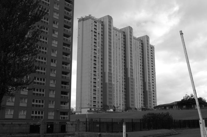 The 3-pronged tower on the left is the clock tower of a, now closed, hospital called Ruchill. There are 4 wards left on the site, which are regular targets for local vandals and assorted neds.