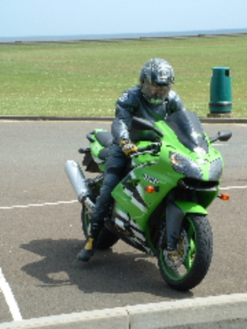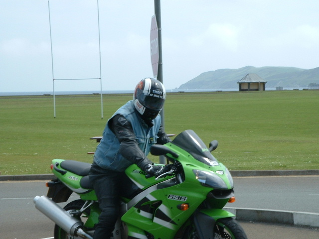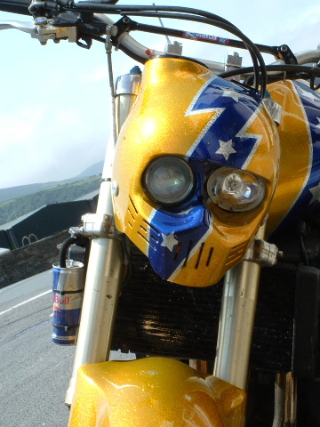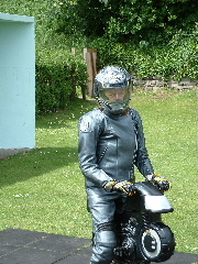 Went to a shop in Ramsey (2nd biggest town) to order some made-to-measure leathers..... went out for a smoke and saw this ~ the owner has used a Simpson Bandit helmet as a headlight cowl.... pretty neat, I thought!
