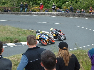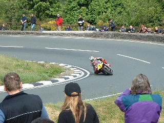 Bit serious now..... this guy is doing about 140mph..... and the spectators on the other side of the road are closer than you see here!! (the black square thing on the left is a traffic-light box... the usual speed limit here is 30mph!!) The cable leading to the box to the right of the rider is from a kerb-cam...... a fella called Phil McCallen took that out with his knee a few years ago!!!