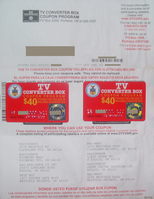 Those who requested the digital signal converter box coupons will be getting a plastic credit card type coupon that has a valid date. They come with a second sheet that gives you online sources for information and lists the many brand of converters they will be accepted against.