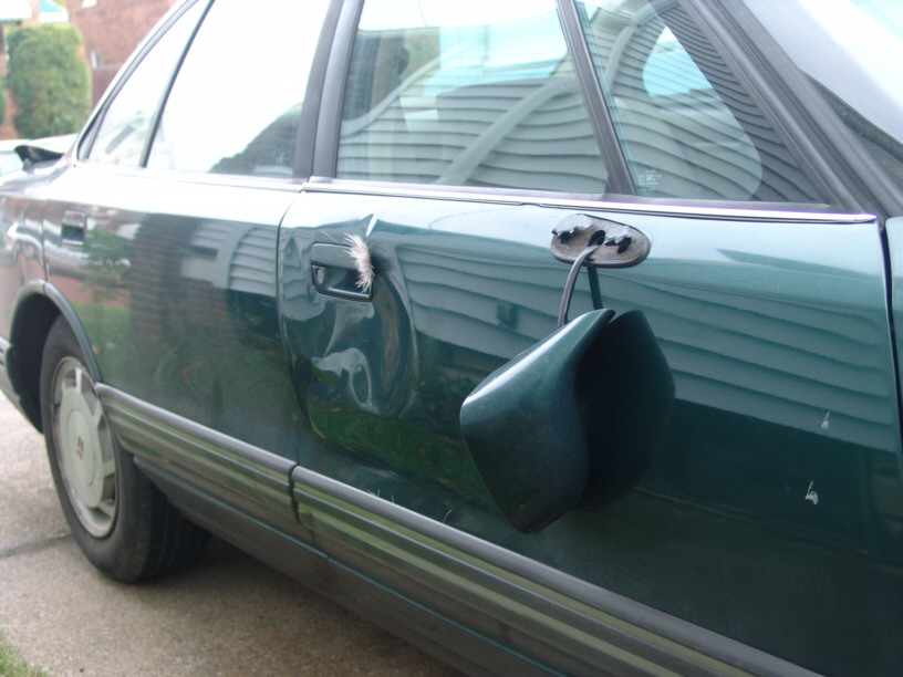 My deer hit was better. Jumped in front of me and I hit it with the driver side front corner of my car. My car is still driving (though I really think it fucked up my transmission). Personally, I'd just hit a junk yard and find a door. They aren't that hard to replace.